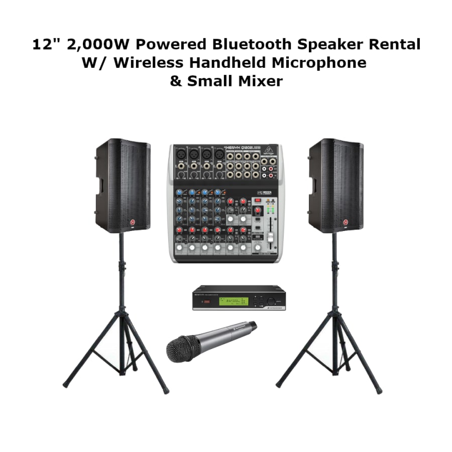 2- 2,000W Powered Bluetooth speakers 2- Speaker Stands 1- Wireless microphone 1- Audio mixer